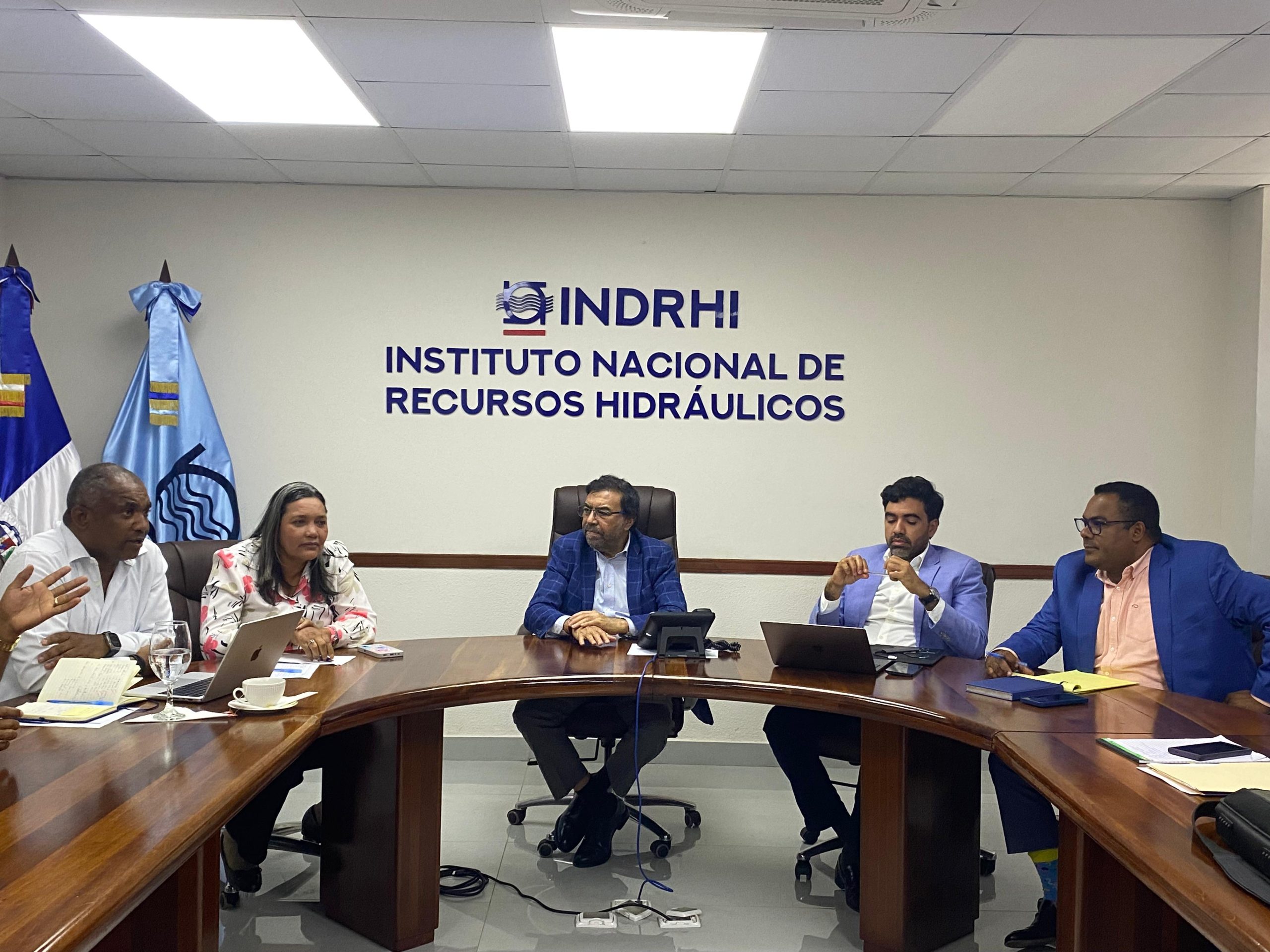 Santo Domingo.– El director ejecutivo del Instituto Nacional de Recursos Hidráulicos (INDRHI), Olmedo Caba Romano, recibió en su despacho a productores del distrito municipal Hato Nuevo Cortés, de Azua, acompañados por la gobernadora Minerva Navarro, con quienes sostuvo un encuentro de seguimiento al proceso de diálogo y concertación para el pago de compensación por parcelas impactadas por la elevación de nivel del embalse de la presa de Montegrande.